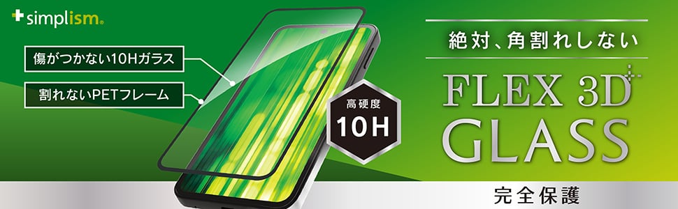強化ガラスで画面の広範囲を保護し、端末本体の形状に沿った立体成型のPETフレームが周りを覆うことで、角からの落下や衝撃で起こる「角割れ」を防ぎます。