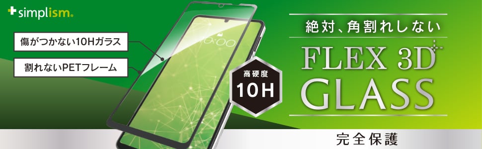 強化ガラスで画面の広範囲を保護し、端末本体の形状に沿った立体成型のPETフレームが周りを覆うことで、角からの落下や衝撃で起こる「角割れ」を防ぎます。