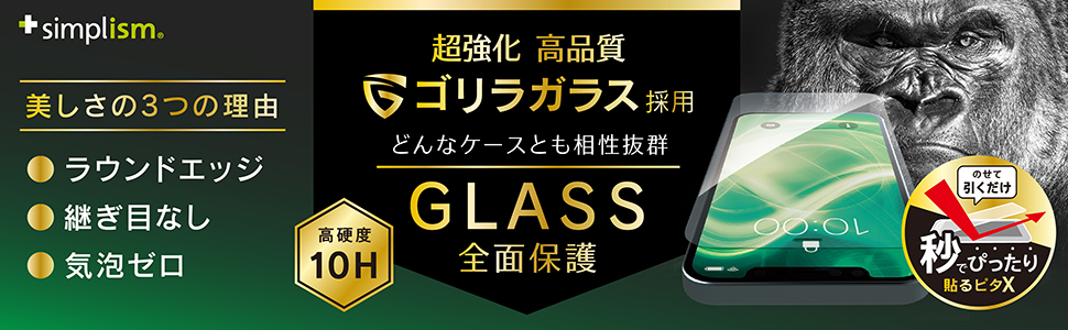 しなやかで割れにくい高品質のゴリラガラスを採用。端をなめらかに加工した全画面保護のガラスプロテクターです。ケースに干渉しない安心サイズで、ブルーライトを約40%低減する目にやさしい光沢タイプです。