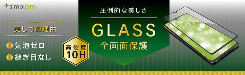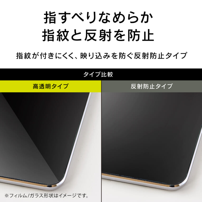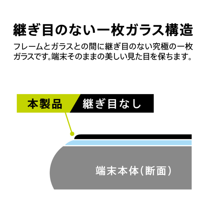 端末との一体感が美しい、継ぎ目のない一枚ガラスです。端をなめらかに加工した全画面保護のガラスプロテクター。指すべりさらさらな反射防止タイプです。