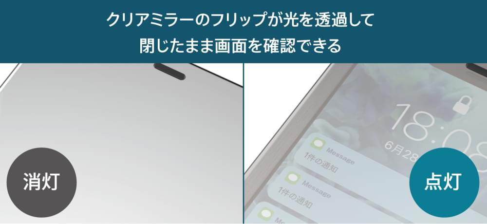 - クリアミラーのフリップが光を透過して閉じたまま画面を確認できる衝撃吸収フリップシェル