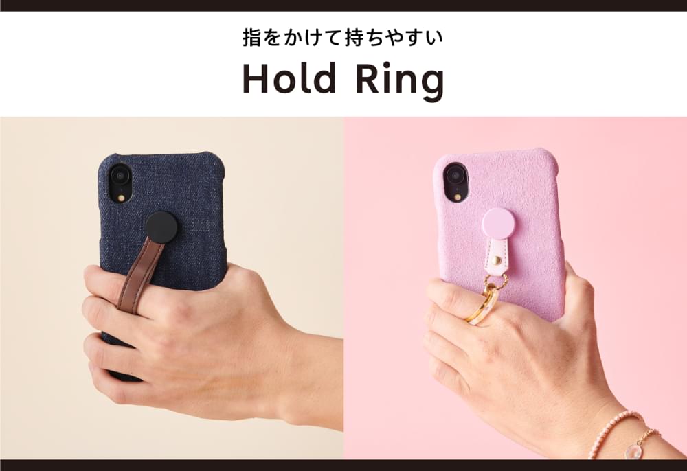 背面に指をかけて持ちやすくなる、ハンドルリング付きケースです。