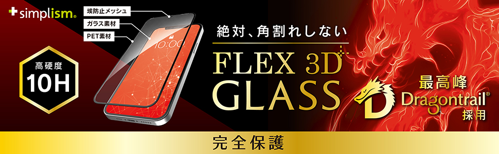 強化ガラスで画面の広範囲を保護し、端末本体の形状に沿った立体成型のPETフレームが周りを覆うことで、角からの落下や衝撃で起こる「角割れ」を防ぎます。
