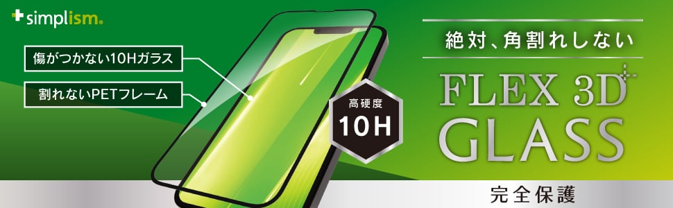 強化ガラスで画面の広範囲を保護し、端末本体の形状に沿った立体成型のPETフレームが周りを覆うことで、角からの落下や衝撃で起こる「角割れ」を防ぎます。