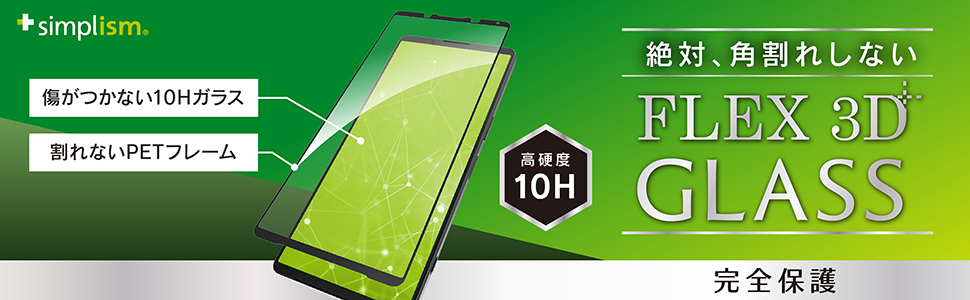 強化ガラスで画面の広範囲を保護し、端末本体の形状に沿った立体成型のPETフレームが周りを覆うことで、角からの落下や衝撃で起こる「角割れ」を防ぎます。