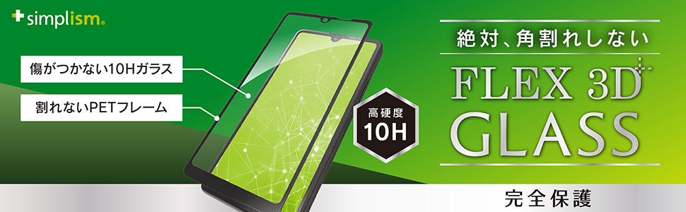 強化ガラスで画面の広範囲を保護し、端末本体の形状に沿った立体成型のPETフレームが周りを覆うことで、角からの落下や衝撃で起こる「角割れ」を防ぎます。