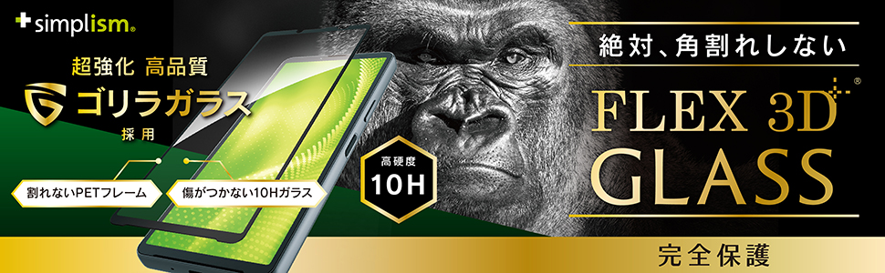 強化ガラスで画面の広範囲を保護し、端末本体の形状に沿った立体成型のPETフレームが周りを覆うことで、角からの落下や衝撃で起こる「角割れ」を防ぎます。