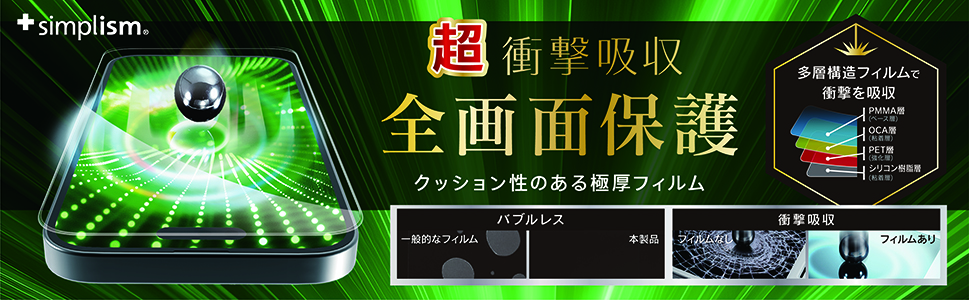 通常のフィルムと比較し、多層構造でクッション性のある極厚フィルムが衝撃を吸収・拡散する保護フィルムです。